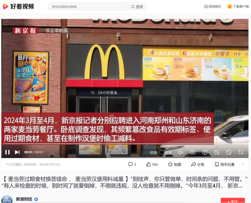 近期,麥當勞多(duō)家餐廳曝過期食材更換標簽,用料減量。涉事餐廳負責人稱“有人來檢(jiǎn)查的時候(hòu)到時間就倒掉,沒人檢查(chá)就不用倒(dǎo)”
