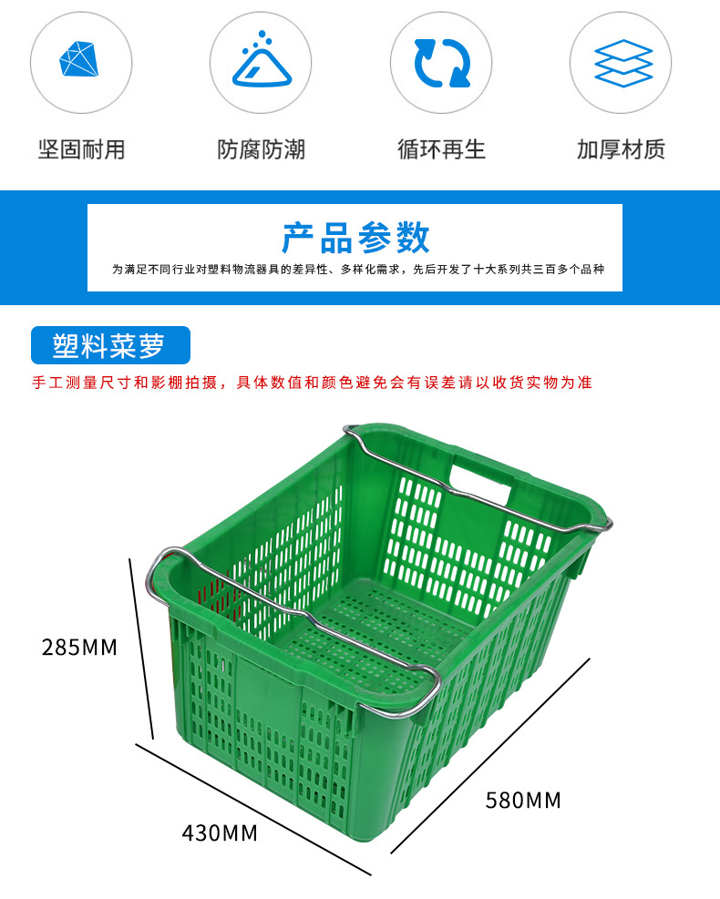 • 工藝優勢 :注塑一體成型,壁厚2-6mm,耐用性遠超普通塑料筐。